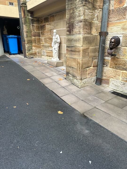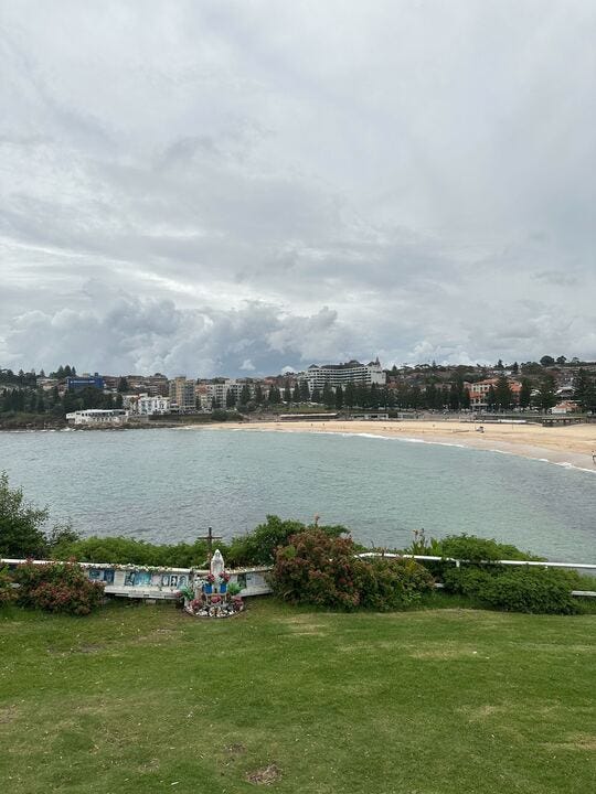 On Friday, after work, I took myself to the beach. As I was leaving, I decided to wander up the hill a little bit. The path forked, and so I asked the Holy Spirit which way to go. I felt a little prompting to take the scenic (e.g., long) route around the walkway… and stumbled right into a Marian apparition site? Apparently Mary appeared on this fence for days in a row in 2003, until someone vandalized the fence one night. There’s a big devotion to her here (the Marian Apparition of Coogee!) I had absolutely no idea about this, nor did I have a clue that I was right next to it! What a gift. Thanks, HS!