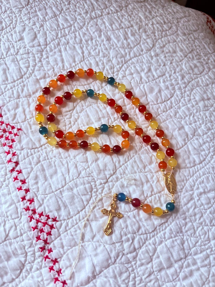 As you know, I’ve been making many, many rosaries, and my friend requested an “Our Lady of Guadalupe” rosary, so I made that this week… dare I say it may be my new favorite?! So bright and fun!