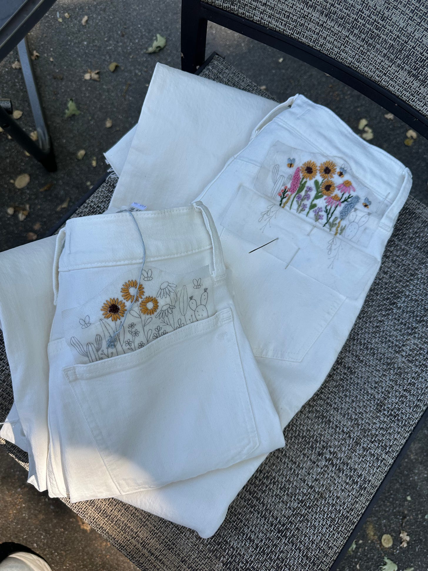 My mom saw these cute embroidered jeans and was determined to make them — so she ordered this set off of Etsy and got to work, and then taught me how to do it! It was one of the most satisfying projects, and so leisurely. Highly recommend embroidery if you’re looking for a little creative activity this summer!
