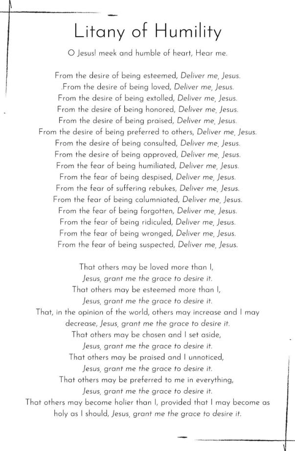 I truly believe that one of the achiest feelings we experience on this side of heaven is being misunderstood. A friend reminded me of the Litany of Humility this week, and while I still think it's the hardest prayer ever, it's also incredibly powerful. I know that my own pride is often the source of my pain, and this prayer helps me name and release it, while inviting God’s grace into those difficult places in my heart.