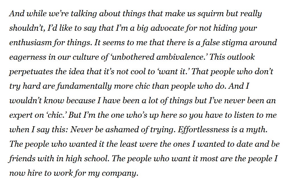 Taylor Swift gave a commencement address at NYU (the year before I graduated, sad) in which I think she addressed “caring” beautifully, and I think about this a lot whenever I’m struggling with the whole caring / not caring conundrum: