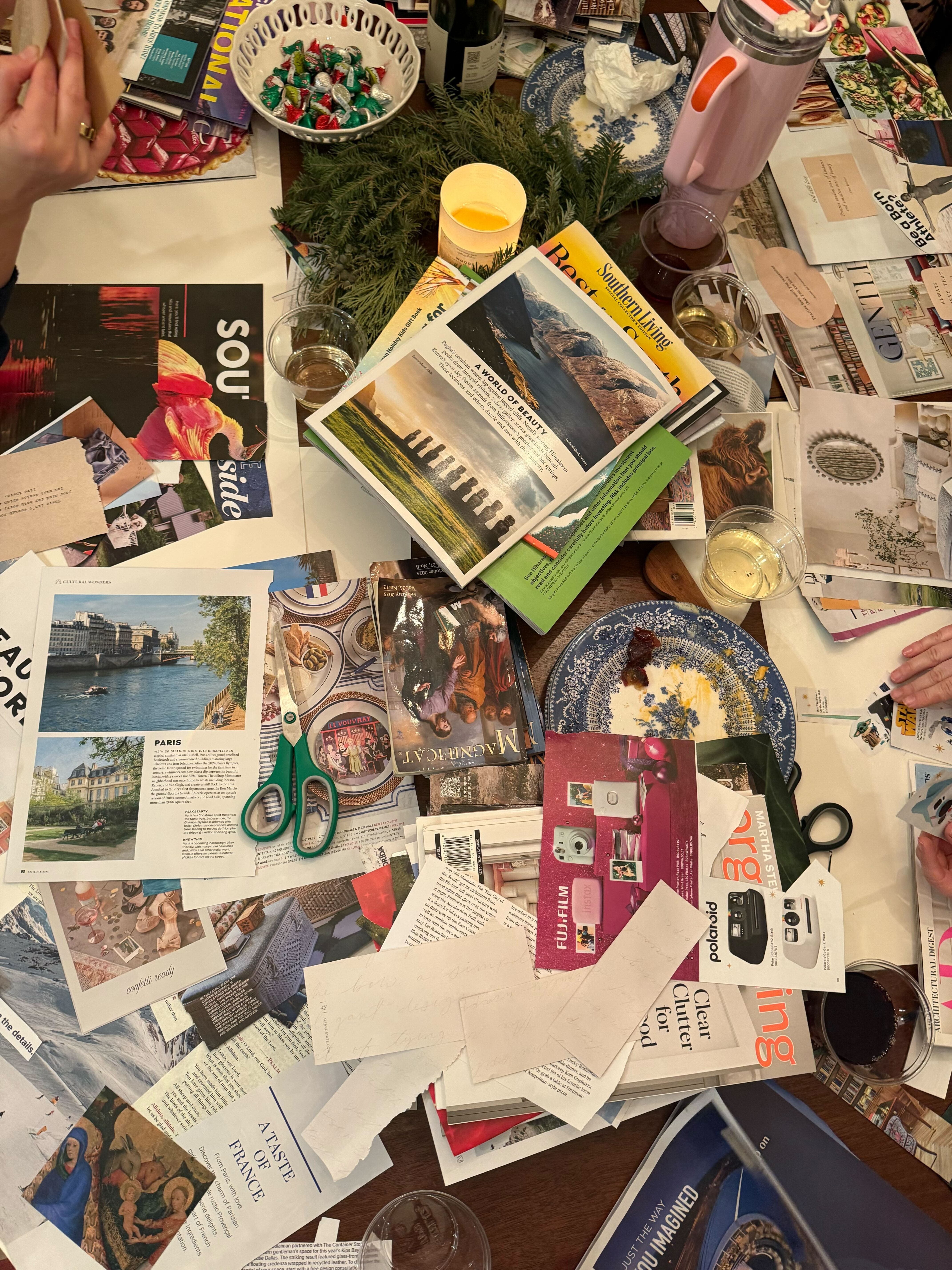 This weekend, I gathered with friends for our second annual “vision board” party. We started in a prayer and guided meditation, then got to cutting up magazines and Magnificats (I save them all year to include scripture on our boards!), eagerly sharing with one another the images and themes we were finding as we pieced them together.